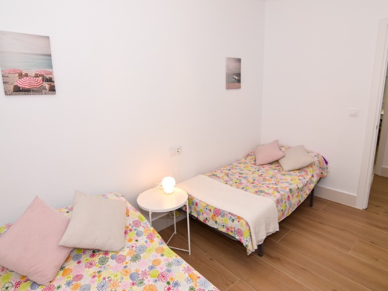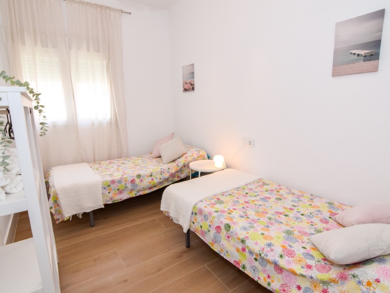 El apartamento se encuentra en una primera planta y cuenta con 2 habitaciones con cama de matrimonio y una habitación con 2 camas individuales, salón, cocina y cuarto de baño.
